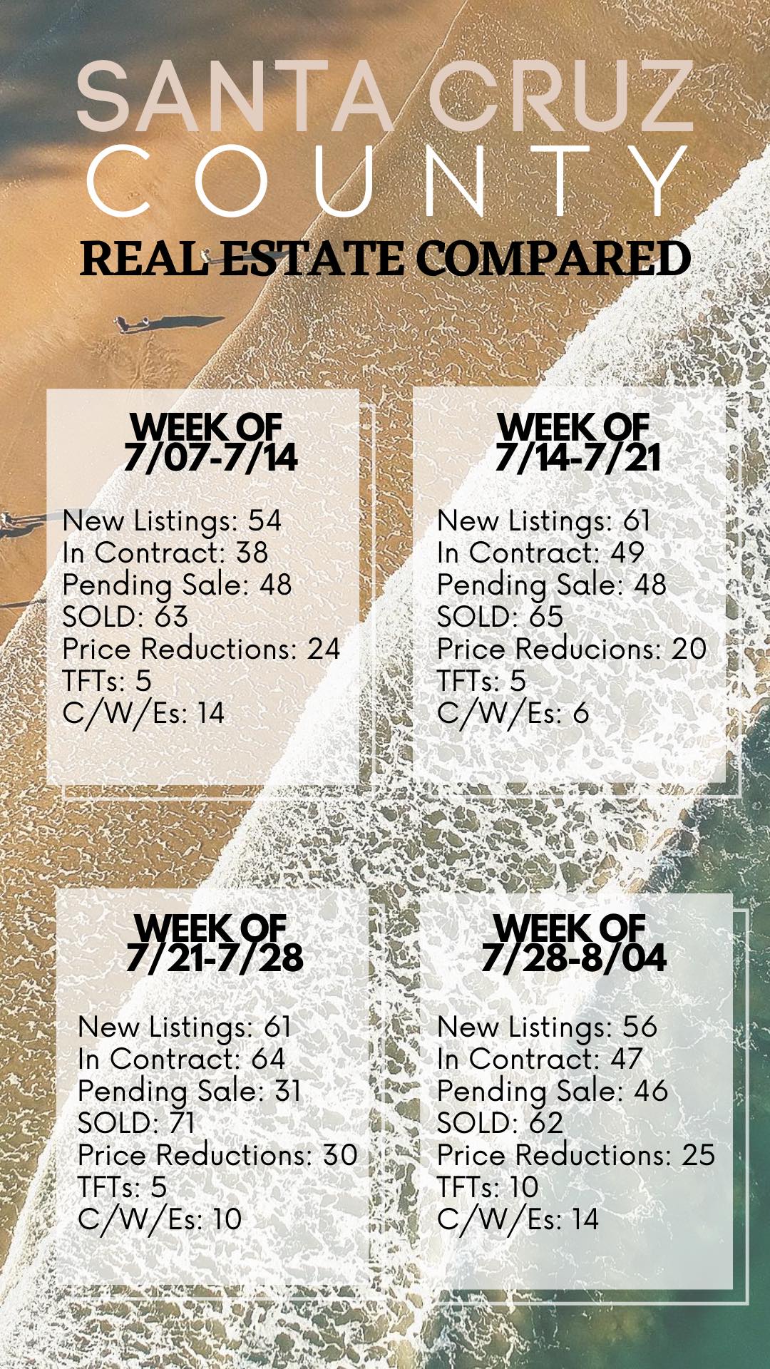 For reference: “TFT” means “transaction fallen through” or canceled escrow. “C/W/E” translates to Canceled, Withdrawn or Expired listings, meaning removed from the market.