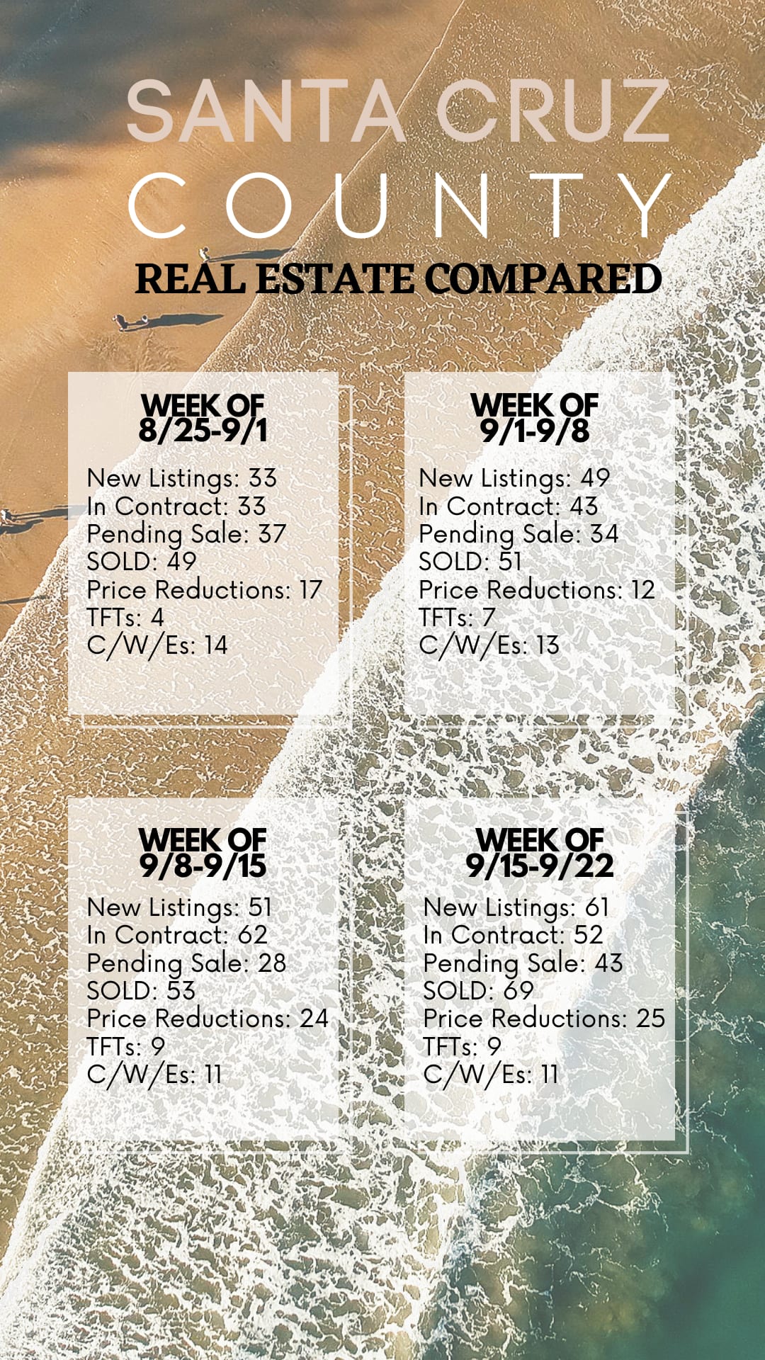 For reference: “TFT” means “transaction fallen through” or canceled escrow. “C/W/E” translates to Canceled, Withdrawn or Expired listings, meaning removed from the market.
